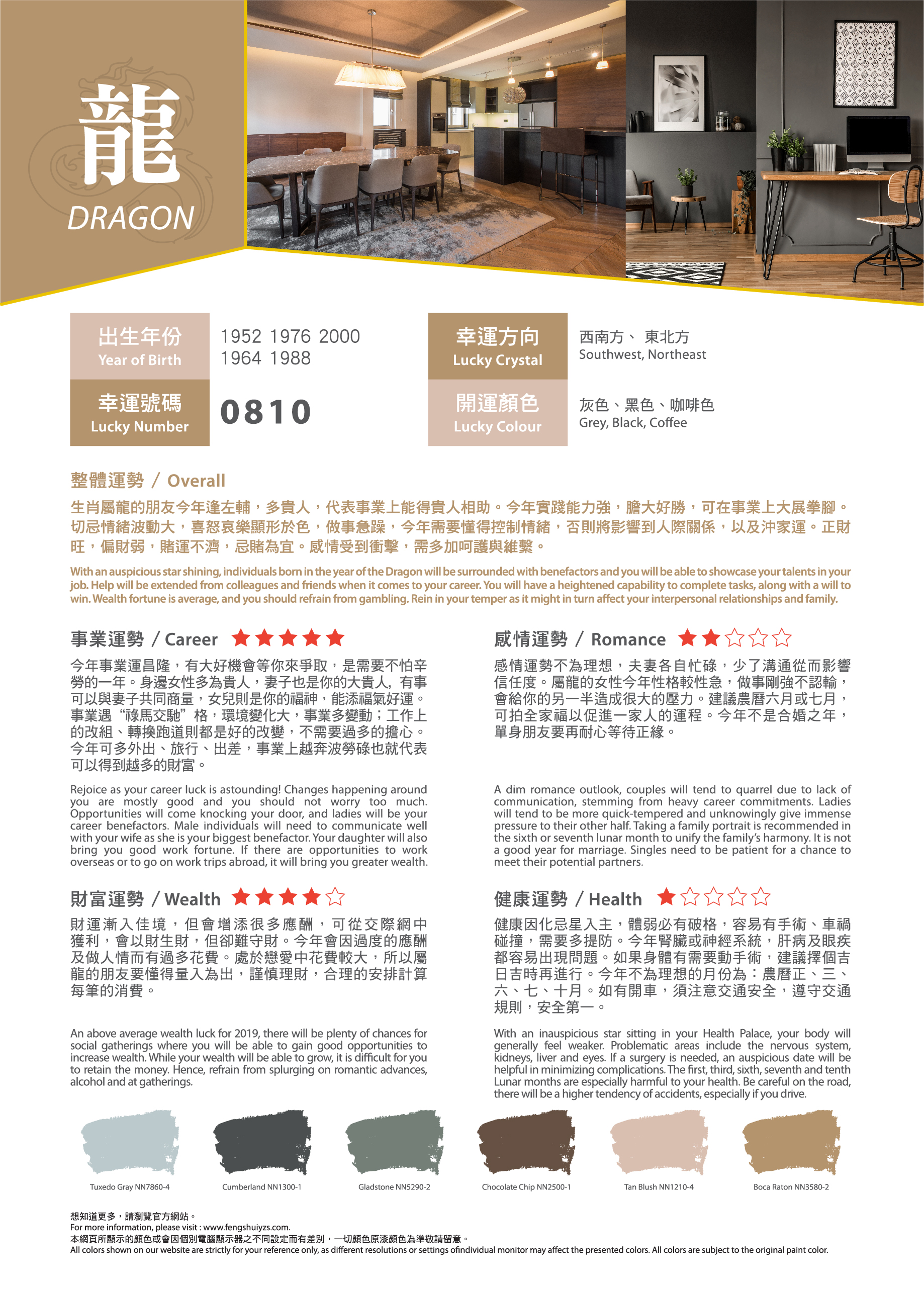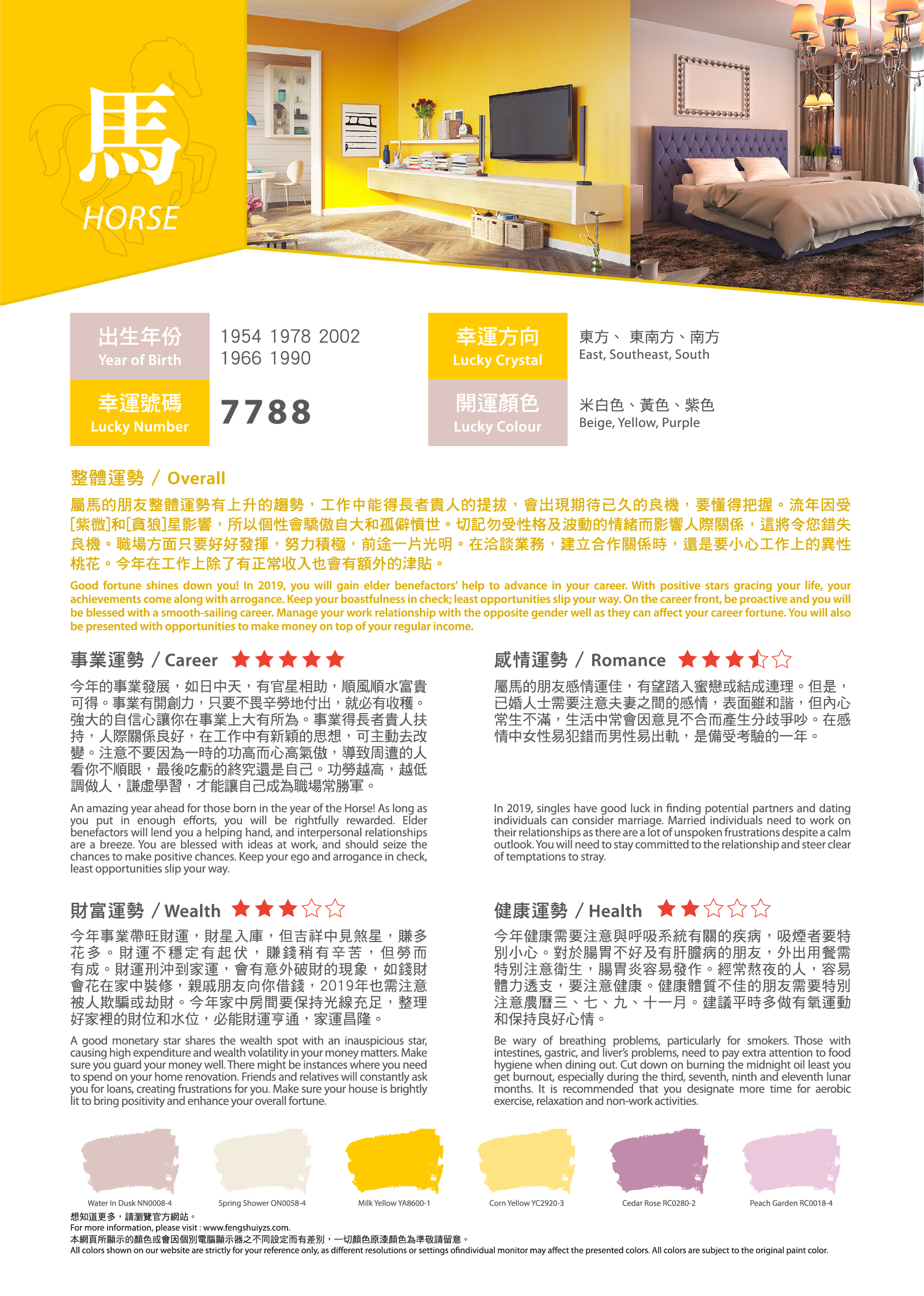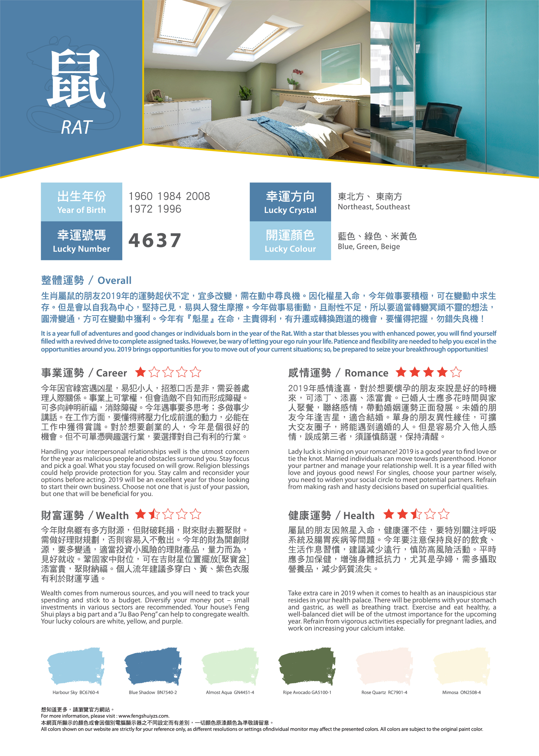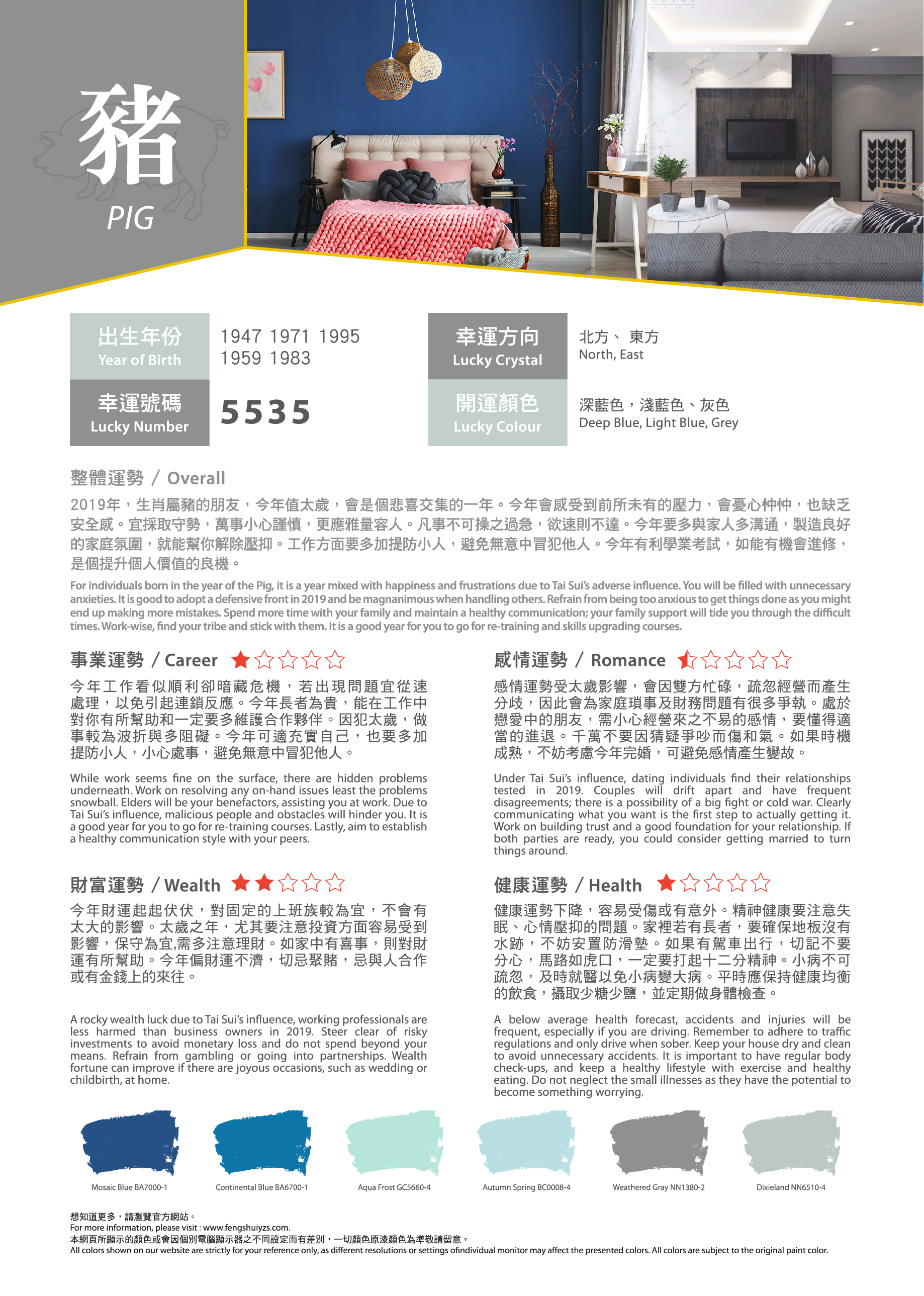農曆新年就快到來,想知道在事業(yè)、感情、財富、健康方面有什麼要注意?找出屬於您的吉祥顏色,運用適當的色彩,可給人舒適愉快的生活空間,為新一年帶來好運!有溫度的色彩,為居家繽紛上妝,好運一整年。立即看看2019年豬年運程色彩吧!?農曆新年就快到來,想知道在事業(yè)、感情、財富、健康方面有什麼要注意?找出屬於您的吉祥顏色,運用適當的色彩,可給人舒適愉快的生活空間,為新一年帶來好運!有溫度的色彩,為居家繽紛上妝,好運一整年。立即看看2019年豬年運程色彩吧!?